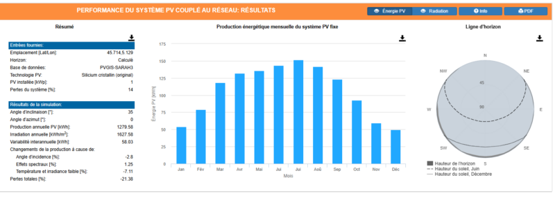 On obtiens des graphiques et des infos mois par mois sur la production qu’on peut espéré. L’outil est aussi intéressant pour simuler plusieurs configuration (orientation ou inclinaison différente par exemple) pour choisir la meilleure option.