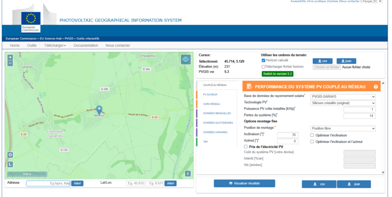 Il suffit d’indiquer simplement l’emplacement géographique, l’orientation, l’inclinaison et la puissance crête de l’installation, et l’outil calcule ce que tes panneaux peuvent produire sur une année complète.